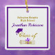 Ornamento de graduación con texto frontal y posterior personalizado. Buen diseño unisexo fácil de personalizar con tu propio texto. Imagen de una tapa de grad morado y diploma empatado correspondiente en un cuadrado enmarcado. En este mismo diseño también están disponibles los colores rojo, negro y de otras capas.