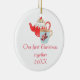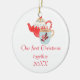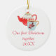 Este adorno de cerámica de doble cara presenta una alegre tetera y una taza y la frase "Nuestra primera Navidad juntos 20XXX". La fecha es personalizable. El reverso del adorno tiene la tetera y la jarra sin el texto.