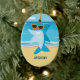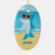 Hay una escena de playa con el océano. En el océano hay un tiburón. Está de pie en su aleta y usando lentes de sol naranjas. En la arena de la playa se puede personalizar para hacer especial con un nombre. Mira nuestros muchos otros diseños!