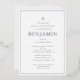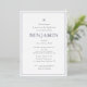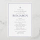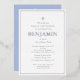 Invitación a la ceremonia de un niño hebreo para el Día de la Nomenclatura. La plantilla tiene un tema azul. La plantilla de diseño es con un texto moderno que se cambia fácilmente a su información. Elija entre una gama de tipos de papel. Al revés, una estrella blanca de David se repite sobre un fondo azul.