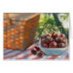 Un bol de cerezas maduras rojas se sienta listo para comer al lado de una canasta de picnic bajo la sombra de un árbol. La original es una pintura al óleo en miniatura de Kathie Miller