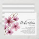 Dulces invitaciones florales para la dedicación de su bebé cuentan con flores de cerezo acuarela en rosa moda. Personalizar con los detalles de la dedicación de su bebé alineados a la derecha y adornados con caligrafía elegante. Las invitaciones se invitan a franjas grises y blancas pálidas.