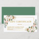 Certificado de regalo de negocios floral acuarela elegante moderno incluye magnolias, rosas rosadas, vegetación botánica y hojas de eucalipto - Marco dorado y texto dorado, parte posterior verde elegante