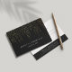 El elegante diseño de un certificado de regalo muestra su nombre y/o nombre de negocio con letras blancas clásicas en un fondo negro rico adornado con cadenas verticales de luces falsas de cuerda de Relieve metalizado dorado. Añada la redacción deseada del certificado de regalo y la información de contacto comercial en el reverso. Una moda y una elección elegante para salones, maquilladores, peluqueros, spas, tiendas y más.