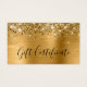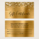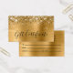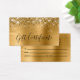 Diseño moderno de glamour para tarjetas pequeñas de visita para certificados de regalo. Todos los textos y líneas son personalizables si necesitas información diferente mientras creas tus propias tarjetas de regalo. Si necesita más de dos líneas para su información de contacto, hay mucho espacio para mover los diferentes elementos. El falso y brillante purpurina de oro en contra de una falsa imagen gráfica de arte digital de Relieve metalizado metálico dorado en esta impresión de diseño como una foto.
