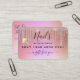 Un glamuroso certificado de regalo al estilo de una tarjeta de crédito. Este deslumbrante material de mercadotecnia presenta goteo de diamantes, símbolo de chip holográfico y escritura moderna. Excelente para profesionales de la industria de la belleza, técnicos de uñas, estilistas de cabello, maquilladores, distribuidores de brillo de labios, técnicos de latigazos, tiendas de belleza de spa cosméticos en línea y más. Personalice el texto para que se ajuste a la descripción de su empresa. Haga clic en la opción personalizar para ajustar el tamaño del texto si es necesario. Tenga en cuenta que se simulan elementos purpurinas, espumosos y holográficos.