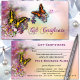 Certificado de regalo romántico y artístico con flores, mariposas y efectos de bokeh. También puede utilizar esta tarjeta como tarjeta de visita normal eliminando la imagen de texto principal y personalizando los textos. Una gran tarjeta de visita para una boutique, terapeuta o cualquier persona en un negocio creativo.
