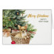 En esta tarjeta de vacaciones, un adorable perro Chihuahua yace en su cama de cesta de mimbre delante de un árbol de Navidad decorado. También detrás de la cesta hay un bonito ramo de bayas rojas de acebo y piñas. El texto en letra dorada a la derecha dice "FELIZ NAVIDAD", con "FELIZ AÑO NUEVO" en verde debajo. Todo el texto, dentro y fuera, se puede cambiar fácilmente a lo que desee. Puede ver más imágenes de Chihuahua, así como imágenes de otras razas, en Dog Village.