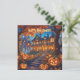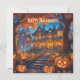 Esta tarjeta contiene una mansión espeluznante en el bosque con ventanas iluminadas rodeadas de muchas calabazas. ¡Envíen saludos de Halloween a sus seres queridos! Texto personalizado.