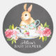 pegatina con ducha de bebé con té de bonito con conejo y tazas de té vintage con flores color de agua rosa colocadas en un fondo de pizarra.