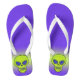 Este par de chancletas son de color violeta profundo con un calavera alienígena de espacio verde brillante con ojos y dientes azules profundos en una franja verde brillante.