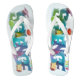 Un par de chanclas blancas con un diseño colorido y caricaturista en las plantas. El diseño parece ser una pila de letras estilizadas con la palabra Ciencia en tonos verdes, azules y morados, con elementos adicionales como una gorra de graduación, zapatillas y libros incorporados al diseño. Las correas de las chancletas son blancas y están hechas de un material texturado. El fondo es blanco y sobrio, destacando el diseño de las chanclas.