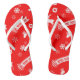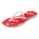 Un par de chancletas con una repetición blanca sin costuras de elementos Navidades -medias, hombre de jengibre, copos de nieve, reno, ornamentos de Navidad, velas, árbol de Navidad y las palabras "Feliz Navidad"- en ilustracion, en un fondo rojo.