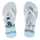 Flip flops con una escena náutica de un velero navegando en un océano agitado con un globo de aire caliente sobre flotando pasó por un faro.