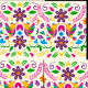 Patrón sin foco con un estilo de bordado otomí mexicano, con pájaros coloridos, flores y hojas sobre un fondo claro. Los pájaros están uno frente al otro, con sus alas esparcidas y las colas apuntando hacia abajo. Las flores están dispuestas de forma simétrica, con los pájaros en el centro. Las hojas se reparten alrededor de las flores y los pájaros, lo que contribuye a la vitalidad general del diseño. La paleta de colores es luminosa y alegre, con una mezcla de colores primarios y secundarios. El estilo recuerda al arte folclórico tradicional mexicano, con un toque moderno. El conjunto es alegre y festivo.
