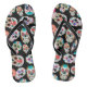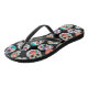 Las imágenes brillantes de los cráneos del azúcar hacen un modelo colorido en estos flips-flopes de la diversión. Hay varias diversas imágenes del cráneo, todo individuales en diversos colores, junto con una serpiente del modelo del estilo del boho. Las imágenes se ponen en un fondo negro.