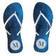 Flip flops de patrón geométrico abstracto personalizado con líneas blancas y puntos sobre fondo de gradiente azul y monograma azul.