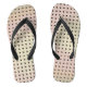 El patrón original de HomeWare en esta correa ancha Flip Flops es exactamente lo que se llama, un patrón de cuadrícula hecho de una fotografía original de la parte posterior de una silla. Los puntos cuadrados de gris oscuro y marrón en filas forman la cuadrícula. Las filas se curvan ligeramente como hace la silla. Arriba, los pequeños puntos cuadrados son agujeros con esquinas redondeadas y una dimensión de sombra alrededor de los bordes superior y derecho. Los colores del cuerpo de la silla son tonos mudos de la naturaleza, verde salvia pálido que se funde en malva pálida, luego suave, marrón arenoso, que parece como si hubieran sido pintados. Este diseño abstracto, con una combinación de colores sofisticados, tiene un aspecto muy moderno.