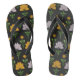 Un patrón sorprendente con flores amarillas y violetas con tallos verdes y hojas sobre un fondo negro.