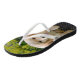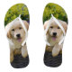 Un joven lindo perrito-observó el perro del golden retriever en una cesta de mimbre en medio de las flores en un jardín. Estos flips-flopes son una idea encantadora del regalo para los amantes del perro y del mascota. Una foto joven del retrato del perrito de Goldie del cutie tomada por Katho Menden. http://www.zazzle.com/kathom_photo