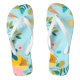 Un par de chanclas coloridas adornadas con motivos florales en un fondo azul intenso.