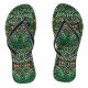 Flip-flops en un vintage William Morris Jacobean con un patrón de papel pintado floral de tulipanes rosa de coral, margaritas amarillas, violetas azules, flores blancas delicadas y follaje verde jade, sobre un fondo negro, realzado digitalmente y de color