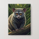 A bush baby with striking orange eyes sits calmly on a branch amidst lush jungle foliage. Its detailed fur texture and alert expression create a captivating scene.
