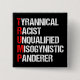El acrónimo anti Trump es un audaz botón político que presenta un poema con una palabra que describe su carácter: un asesino tiránico, racista, sin calificaciones, misógino. Resistan a este presidente y siguen apoyando los esfuerzos de resistencia por la igualdad de derechos y la decencia humana básica en Estados Unidos. Lucha por la libertad en nuestro país para todas las razas y géneros.