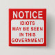 Esta insignia de protesta divertida es sólo lo que hace reír a la gente. Disponible en otros productos, esta insignia está en forma de cartel y dice: AVISO, IDIOTAS PUEDEN SER VISTOS EN ESTE GOBIERNO. - ¡Una extraña señal política que afirma lo obvio! Es grandioso mandarlo al Primer Ministro y a otros políticos. ¡Estoy seguro de que se reirían! ja, ja, ja.