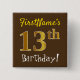 Este sencillo diseño de botón cuadrado muestra un mensaje como "¡Cumpleaños 13 de FirstName!", donde el "13" tiene un aspecto falso/imitación de color dorado, en un fondo de color marrón. El nombre se puede personalizar. Botones como este podrían ser usados por los invitados en una fiesta de cumpleaños para alguien que está celebrando su decimotercer cumpleaños, donde el fiesta está siendo retenido en una gran zona con muchas otras personas presentes (como un parque de la ciudad o un parque temático). [~Z0000165]