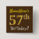 Este sencillo diseño de botón cuadrado muestra un mensaje como "¡Nombre, este es el cumpleaños número 57!", con el "57" con un aspecto de color falso/imitación de oro, en un fondo de color marrón. El nombre se puede personalizar. Botones como este podrían ser usados por los invitados en una fiesta de cumpleaños para alguien que está celebrando su 57º cumpleaños, donde el fiesta está siendo retenido en una gran zona con muchas otras personas presentes (como un parque de la ciudad o un parque temático). [~Z0000165]