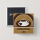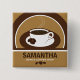 © Sunny Mars Designs. Cafetería café marrón y beige Personal Etiqueta de identidad Botón Pinback de Square - Personal de café de Guay, botón de etiqueta de nombre de camarera o camarera con un moderno, moderno, elegante, lindo, estilizado diseño de icono de ilustracion gráfico de una taza de vapor o taza de café y platillo. Personalizar al agregarle tu propio texto. Etiqueta de nombre perfecta para los empleados de la cafetería.