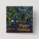 botón bonito de vacaciones. Perfecto como etiqueta de nombre de vacaciones. La pintura acuarela es de una noche nublada y húmeda en una calle decorada de la ciudad. Los árboles están entrelazados con luces de bonito. El texto dice "Felices fiestas", y hay un campo de nombre de personalizable. El diseño presenta mi acuarela original titulada "Calle de los Navidades", © Sandy Long. ¿Quieres este o un diseño similar en otro artículo? Navega por mi tienda Kayatiyu. Kayatiyu significa tener una hermosa forma.