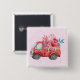 Un botón con un lindo camión de color rojo. Llevando corazones y flores en la espalda. Te amo, escrito de un lado. Genial y adorable. Fondo con estampado rosa claro.