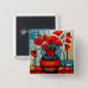 A.I. la interpretación creada de las amapolas rojas vibrantes se presenta de forma estilizada, floreciendo a partir de un jarrón marrón rayado y azul contra un fondo compuesto de formas geométricas surrealistas.