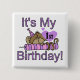 ¡Un mono adorable del chica que lleva un rosa y la lavanda van de fiesta el gorra, un rosa rayado gigante y la vela del cumpleaños de la lavanda, y el texto que la lee "es mi 1r cumpleaños" en las primeras camisetas, monos, tarjetas, franqueo, imanes, y más del cumpleaños!