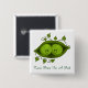 Ilustracion lindo de dos arvejas personalizados redondeadas verdes sentadas cómodamente dentro de una vaina verde. Cada guisante tiene una cara feliz con una sonrisa dulce. Por encima y por debajo de la vaina hay viñas con hojas. En la parte inferior de la insignia y bajo el diseño están las palabras "Two Peas In Pod" en texto verde.