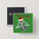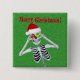 Este botón de retroceso cuadrado es verde con pequeños grilletes de oro y un esqueleto feliz sosteniendo adornos rojos y verdes hasta los ojos con un sombrero de Santa roja. Feliz texto navideño en la cima de rojo.
