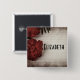 Personalice su nombre con un tipo de letra Art Deco en negrita de color negro. Este botón tiene una fotografía de otoño con temática floral. Papel de escritura florido con algunas flores rojas bonitos colocadas alrededor de los bordes.