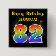 Este divertido y vibrante diseño de botones presenta un colorido estallido de fuegos artificiales de celebración inspirado, junto con el número "82" que presenta un espectro multicolor inspirado en el arcoiris o un patrón de gradiente. También incluye un nombre de personalizable y un mensaje de evento, como un saludo de cumpleaños "Feliz". Un botón como este puede ser usado por los asistentes a una fiesta de cumpleaños que se lleva a cabo para celebrar el 82 cumpleaños de alguien. [~Z0000334]