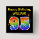Este divertido y vibrante diseño de botones presenta un colorido patrón inspirado en la explosión de fuegos artificiales de celebración, junto con el número "95" que tiene un espectro multicolor inspirado en el arcoiris o un patrón de gradiente. También incluye un nombre personalizado y un mensaje de evento, como un saludo de cumpleaños "feliz". Un botón como este puede ser usado por los invitados en una fiesta de cumpleaños que se lleva a cabo para celebrar los noventa y cinco años de alguien. [~Z0000334]