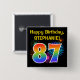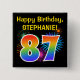 Este divertido y vibrante diseño de botones presenta un colorido estallido de fuegos artificiales de celebración inspirado, junto con el número "87" que tiene un multicolor como el espectro o el patrón gradiente. También incluye un nombre de personalizable y un mensaje de evento, como un saludo de cumpleaños "Feliz". Un botón como este puede ser usado por los invitados en una fiesta de cumpleaños que se lleva a cabo en celebración de los ochenta y siete años de alguien. [~Z0000334]