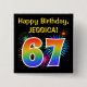 Este divertido y vibrante diseño de botones presenta un colorido patrón inspirado en los fuegos artificiales de celebración reventados, junto con el número "67" que presenta un espectro multicolor inspirado en el arcoiris o un patrón de gradiente. También incluye un nombre personalizado y un mensaje de evento, como un saludo de cumpleaños "feliz". Un botón como este puede ser usado por los asistentes a una fiesta de cumpleaños que se lleva a cabo para celebrar el 67 cumpleaños de alguien. [~Z0000334]