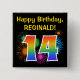 Este divertido y vibrante diseño de botones presenta un colorido estallido de fuegos artificiales de celebración inspirado, junto con el número "14" que presenta un espectro multicolor inspirado en el arcoiris o un patrón de gradiente. También incluye un nombre personalizado y un mensaje de evento, como un saludo de cumpleaños "feliz". Un botón como este puede ser usado por los invitados en una fiesta de cumpleaños que se lleva a cabo en celebración de los 14 años de alguien. [~Z0000334]