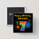 Este divertido y vibrante diseño de botones presenta un patrón colorido inspirado en fuegos artificiales de celebración reventando, junto con el número "7" que tiene un arcoiris multicolor como el espectro o el patrón gradiente. También incluye un nombre personalizado y un mensaje de evento, como un saludo de cumpleaños "feliz". Un botón como este puede ser usado por los asistentes a una fiesta de cumpleaños que se lleva a cabo para celebrar el séptimo cumpleaños de alguien. [~Z0000334]