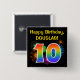 Este divertido y vibrante diseño de botones presenta un colorido estallido de fuegos artificiales de celebración inspirado, junto con el número "10" que tiene un espectro multicolor inspirado en el arcoiris o un patrón de gradiente. También incluye un nombre personalizado y un mensaje de evento, como un saludo de cumpleaños "feliz". Un botón como este podría ser usado por los asistentes en una fiesta de cumpleaños que se lleva a cabo en celebración del décimo cumpleaños de alguien. [~Z0000334]