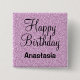 Personalizado gentil y glamur botón Feliz cumpleaños con un fondo brillante purpurina morado y elegante escritura negra. Puede agregar fácilmente el nombre de su elección y cambiar el color y la fuente del nombre utilizando la opción personalizar.