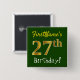 Este sencillo diseño de botón cuadrado muestra un mensaje como "¡Cumpleaños 27 de FirstName!", con el "27" con un aspecto falso/imitación de color dorado, en un fondo de color verde. El nombre se puede personalizar. Botones como este podrían ser usados por los invitados en una fiesta de cumpleaños para alguien que está celebrando su vigésimo séptimo cumpleaños, donde el fiesta está siendo retenido en una gran zona con muchas otras personas presentes (como un parque de la ciudad o un parque temático). [~Z0000163]
