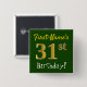 Este sencillo diseño de botón cuadrado muestra un mensaje como "¡Cumpleaños 31 del Primer Nombre!", con el "31º" con un aspecto falso/imitación de color dorado, en un fondo de color verde. El nombre se puede personalizar. Botones como este podrían ser usados por los invitados en una fiesta de cumpleaños para alguien que está celebrando su 31 cumpleaños, donde el fiesta está siendo retenido en un gran área con muchas otras personas presentes (como un parque de la ciudad o un parque temático). [~Z0000163]