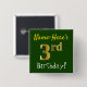 Este sencillo diseño de botón cuadrado muestra un mensaje como "¡Nombre-Aquí es el tercer cumpleaños!", con el "3er" con un aspecto falso/imitación de color dorado, en un fondo de color verde. El nombre se puede personalizar. Botones como este podrían ser usados por los invitados en una fiesta de cumpleaños para alguien que está celebrando su tercer cumpleaños, donde el fiesta está siendo retenido en una gran zona con muchas otras personas presentes (como un parque de la ciudad o un parque temático). [~Z0000163]